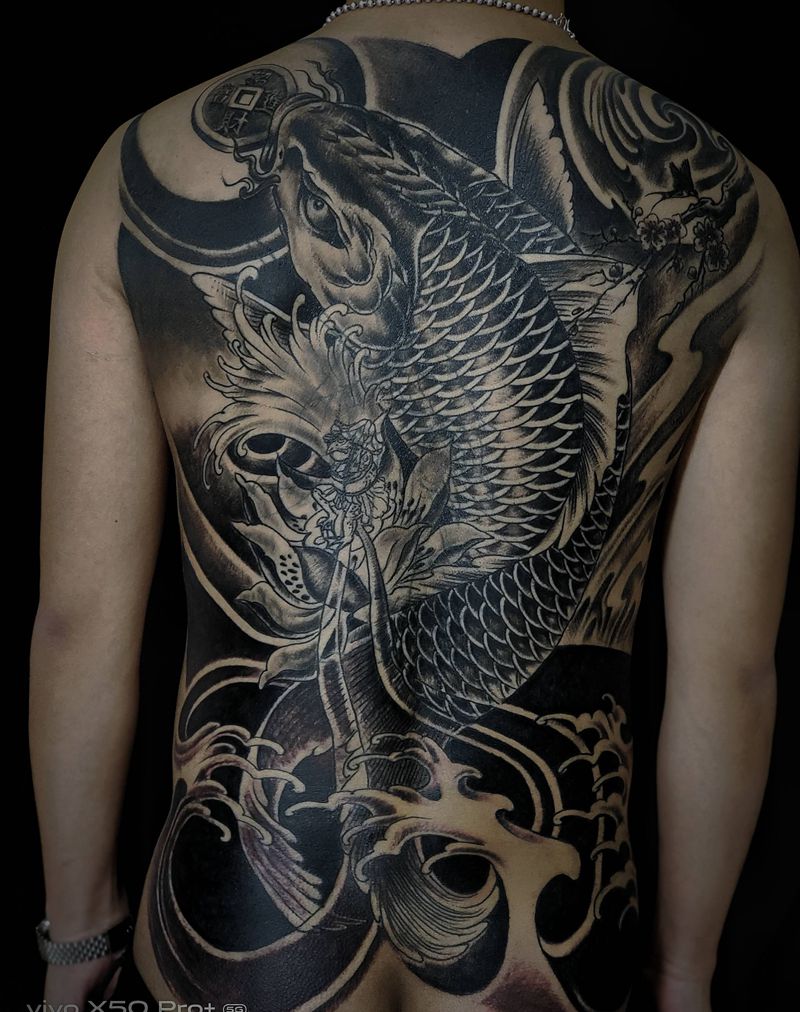 当前位置: 首页 >山西省太原市纹身店-太原翼龙刺青工作室纹身图案>满背招财鱼纹身图片_背部老传统纹身图案