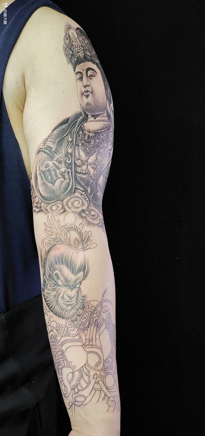 当前位置: 首页 >山西省太原市纹身店-太原翼龙刺青工作室纹身图案>悟空拜菩萨花臂纹身图片_手臂新传统纹身图案