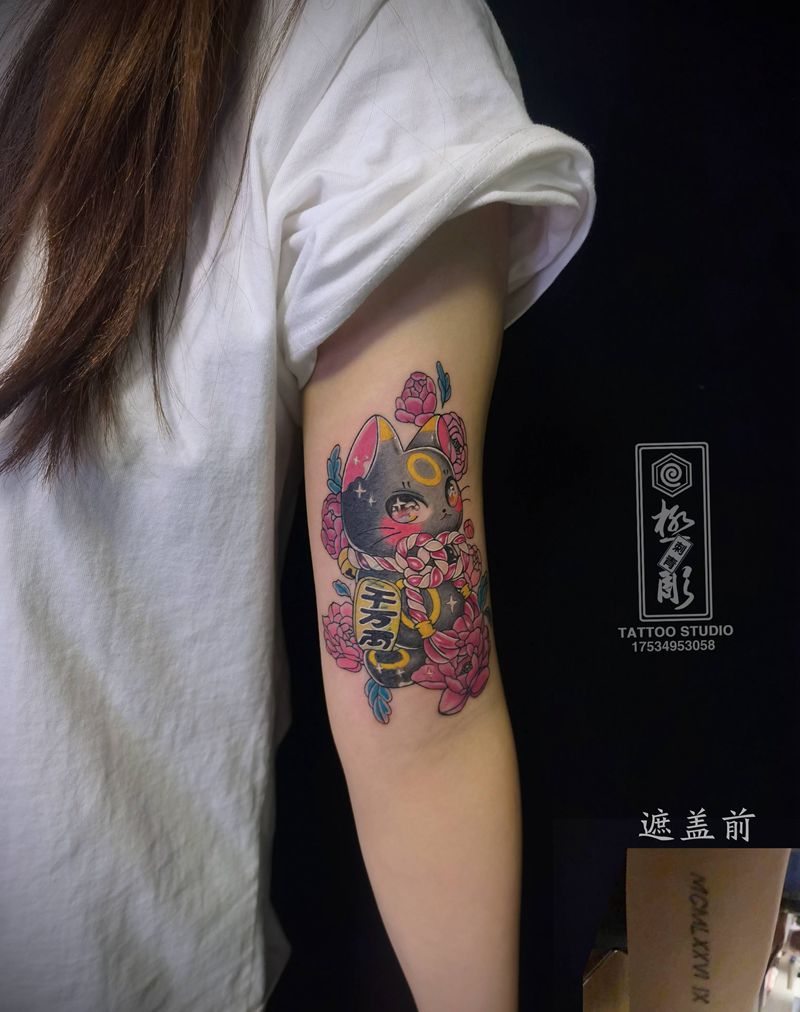 遮盖招财猫纹身图片_手臂老传统遮盖纹身图案