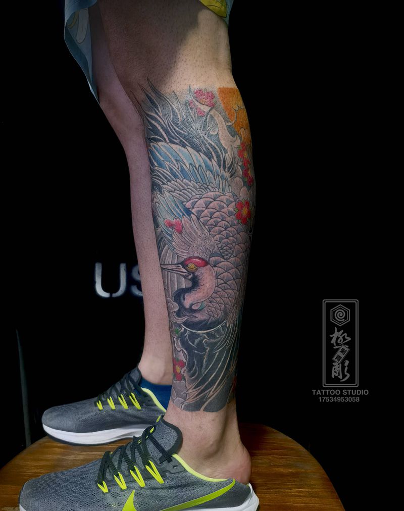 舍利仙鹤包小腿纹身图片_腿部老传统遮盖纹身图案