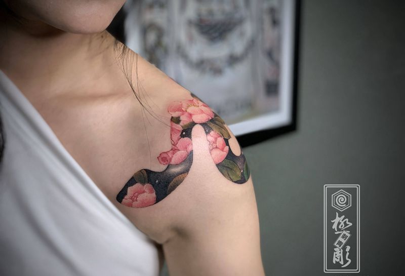“花”蛇纹身图片_肩部背部遮盖纹身图案