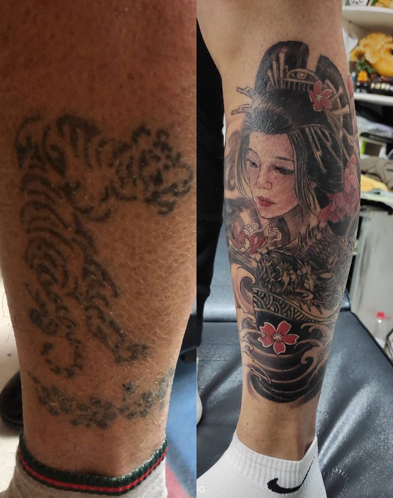 遮盖纹身纹身图片_腿部新传统遮盖旧纹身艺伎纹身图案