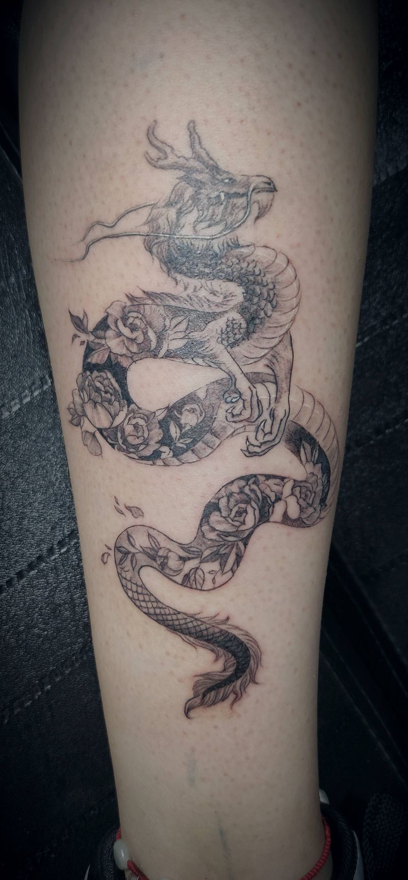 素花小龙纹身图片_腿部新传统素花龙纹身图案