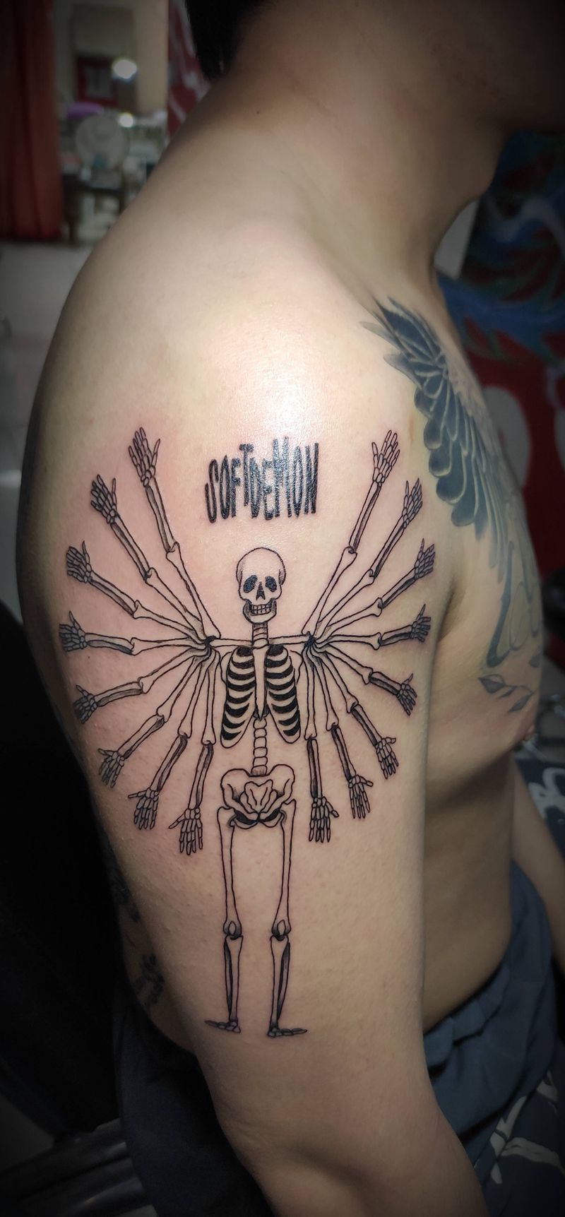 当前位置: 首页 >山西省大同市纹身店-精雕纹刺纹身图案>温柔的恶魔纹身图片_手臂几何新传统骷髅纹身图案