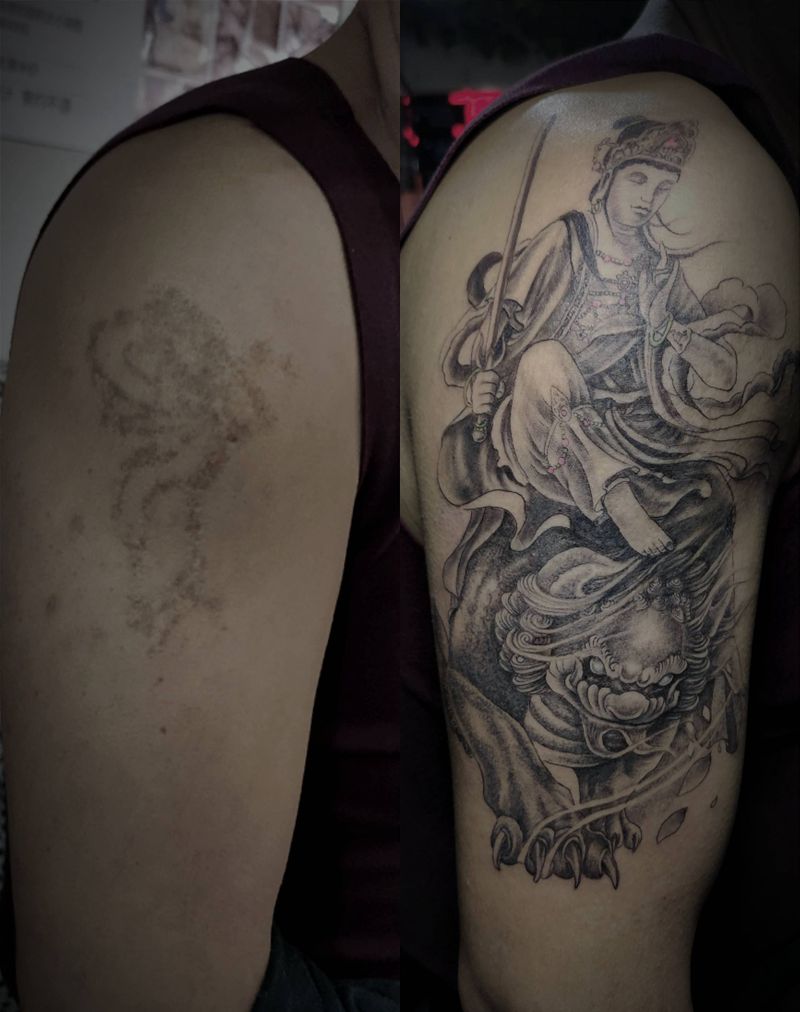 当前位置: 首页 >山西省大同市纹身店-精雕纹刺纹身图案>文殊菩萨遮盖小疤痕纹身图片_手臂肩部新传统点刺荧光纹身纹身图案