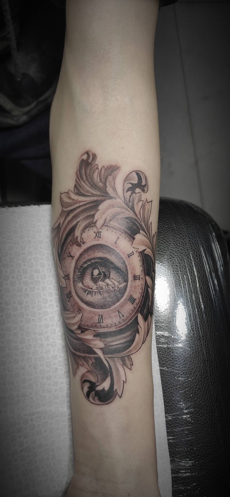 当前位置: 首页 >山西省大同市纹身店-精雕纹刺纹身图案>唐草时钟纹身图片_手臂欧美写实点刺时钟唐草眼睛纹身图案