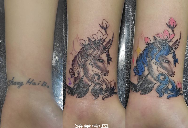 独角兽遮盖字母纹身图片_手部手臂New School新传统纹身图案