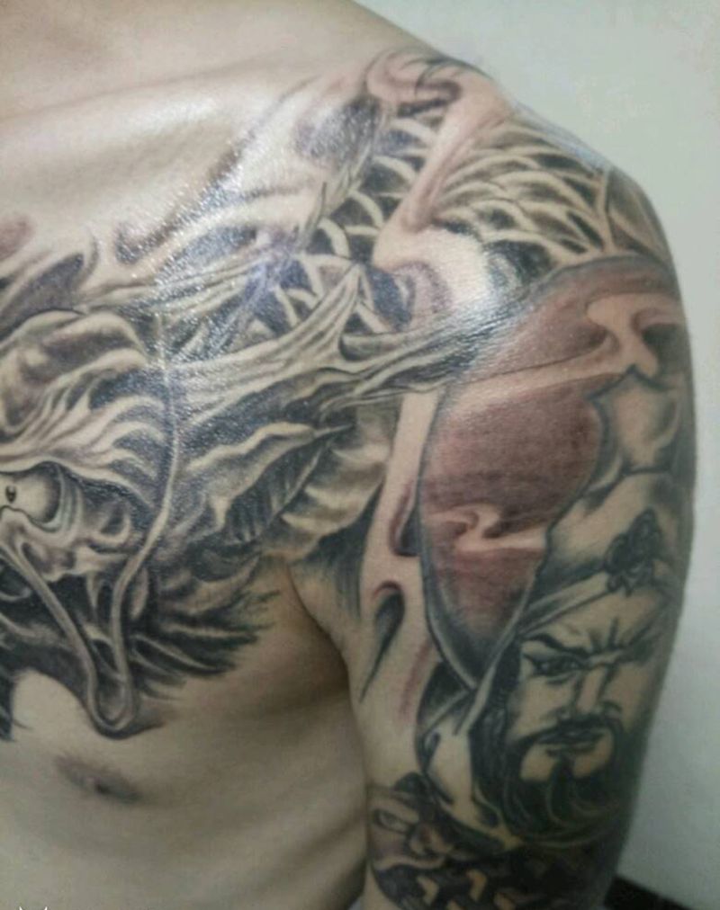 《驭龙》纹身图片_肩部胸部传统动物龙关公成品纹身图案