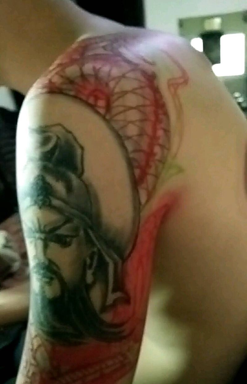 当前位置: 首页 >山西省大同市纹身店-精雕纹刺纹身图案>《驭龙》纹身图片_肩部胸部传统动物龙关公成品纹身图案