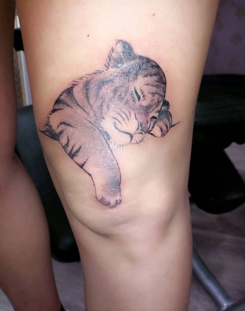当前位置: 首页 >山西省大同市纹身店-精雕纹刺纹身图案>小老虎纹身图片_腿部清新写实动物成品纹身图案