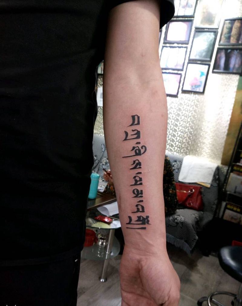 当前位置: 首页 >山西省大同市纹身店-精雕纹刺纹身图案>梵文/藏文纹身图片_手臂清新字符藏文成品纹身图案