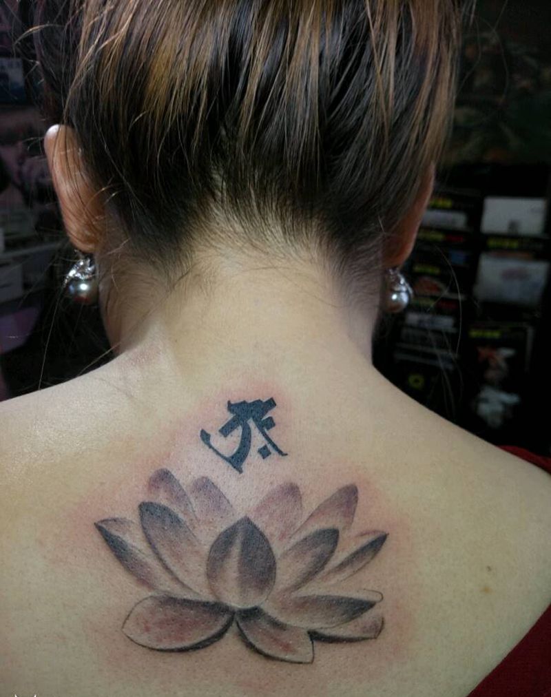 守护佛,莲花纹身图片_背部清新写实字符植物成品纹身图案