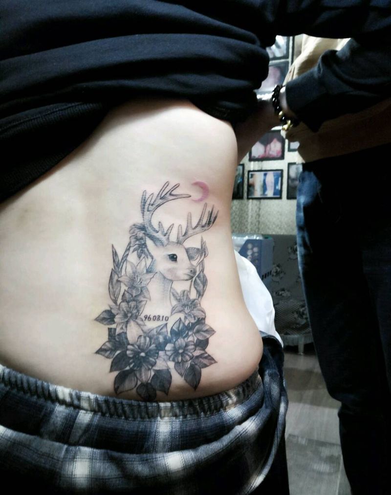 素花鹿头遮盖英文纹身图片_腰部清新动物植物成品纹身图案