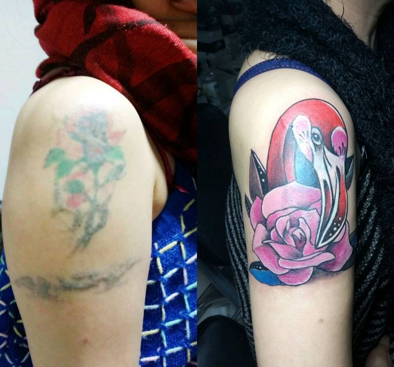 火烈鸟遮盖旧纹身纹身图片_肩部New School纹身图案