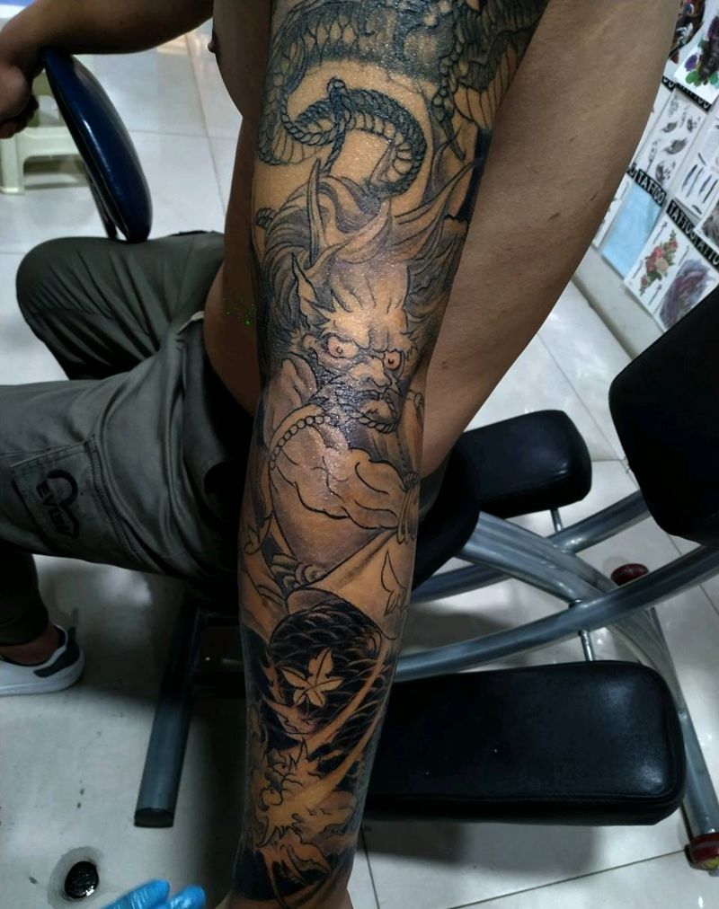 • T网红王老大花腿龙纹身图片_腿部新传统纹身图案