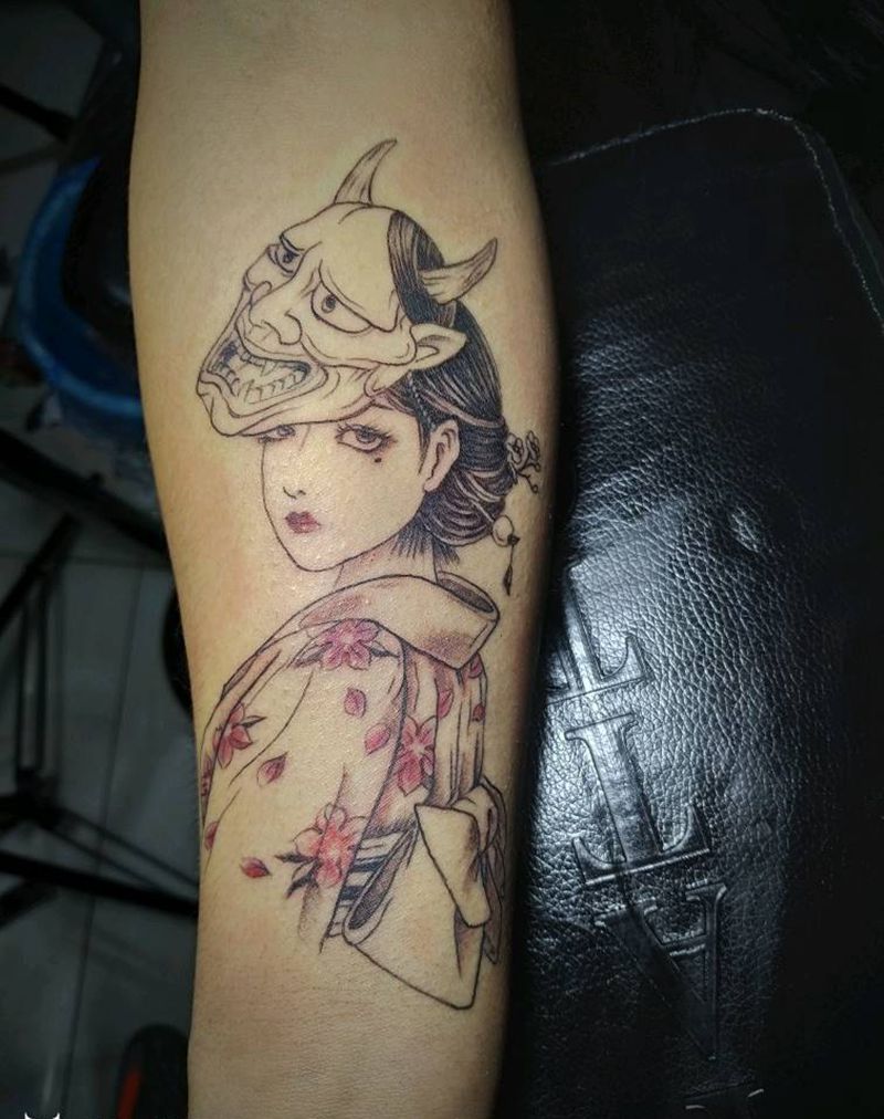 当前位置: 首页 >山西省大同市纹身店-精雕纹刺纹身图案>清新艺伎纹身图片_手臂新传统New School纹身图案