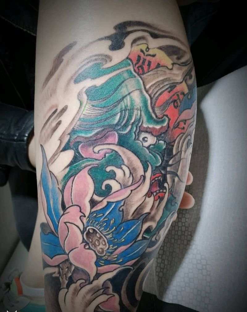 当前位置: 首页 >山西省大同市纹身店-精雕纹刺纹身图案>般若荷花纹身图片_腿部新传统纹身图案