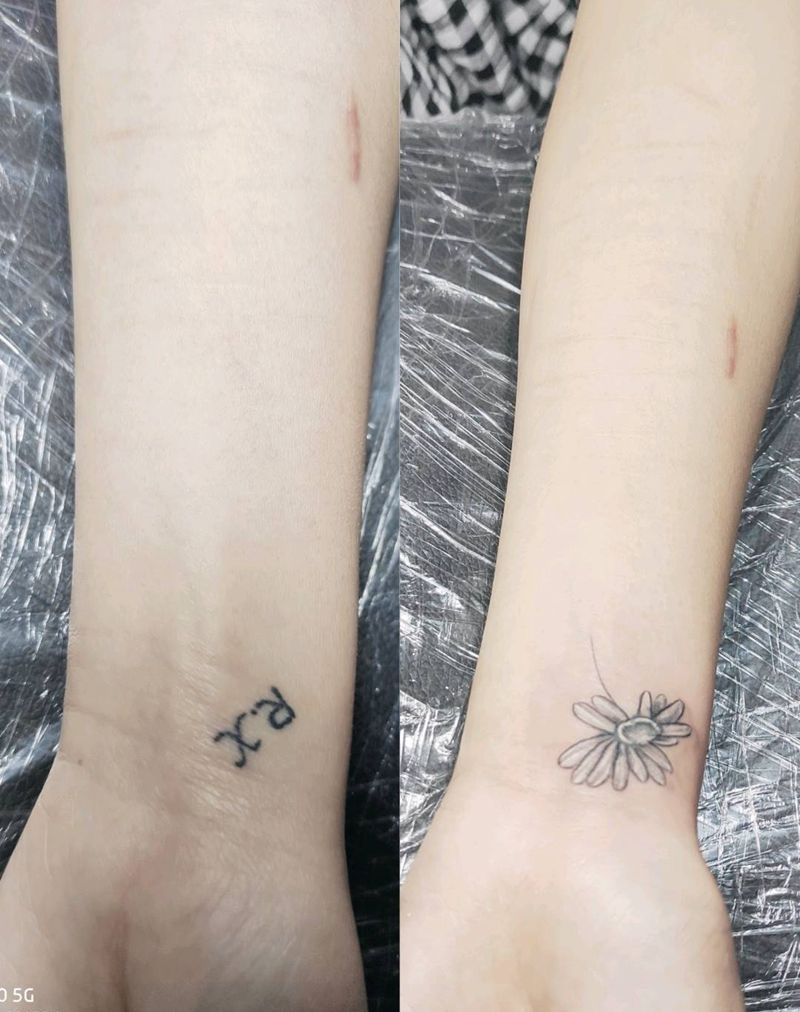 字母变菊花纹身图片_手臂清新遮盖纹身图案