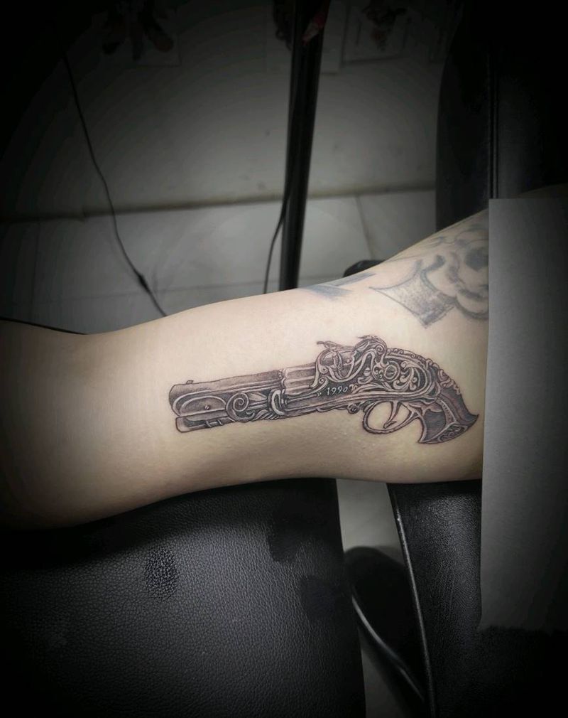 当前位置: 首页 >山西省大同市纹身店-精雕纹刺纹身图案>火枪纹身图片_手臂大臂内测纹身图案