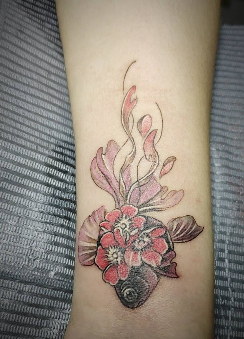 当前位置: 首页 >山西省大同市纹身店-精雕纹刺纹身图案>金鱼遮盖旧字母纹身图片_手臂New School新传统清新纹身纹身图案