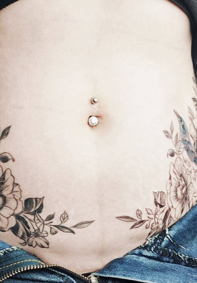 素花遮盖妊娠纹恢复后纹身图片_腹部新传统欧美写实纹身图案