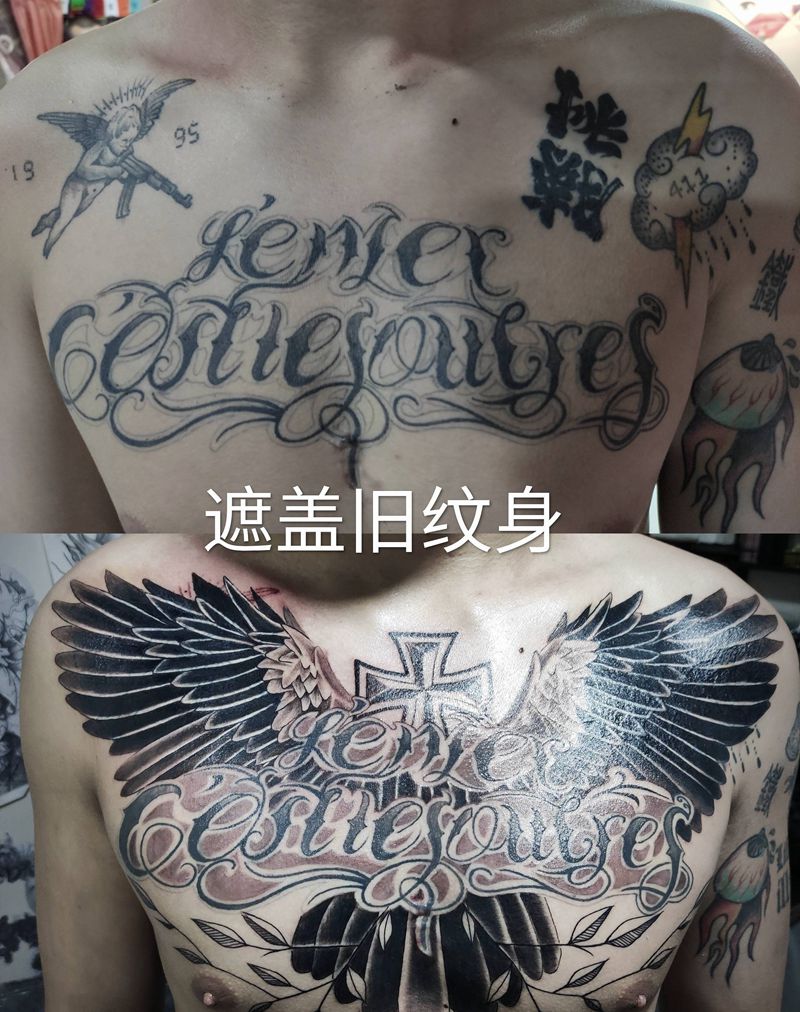 当前位置: 首页 >山西省大同市纹身店-精雕纹刺纹身图案>遮改旧纹身纹身图片_胸部花体字欧美写实翅膀纹身图案