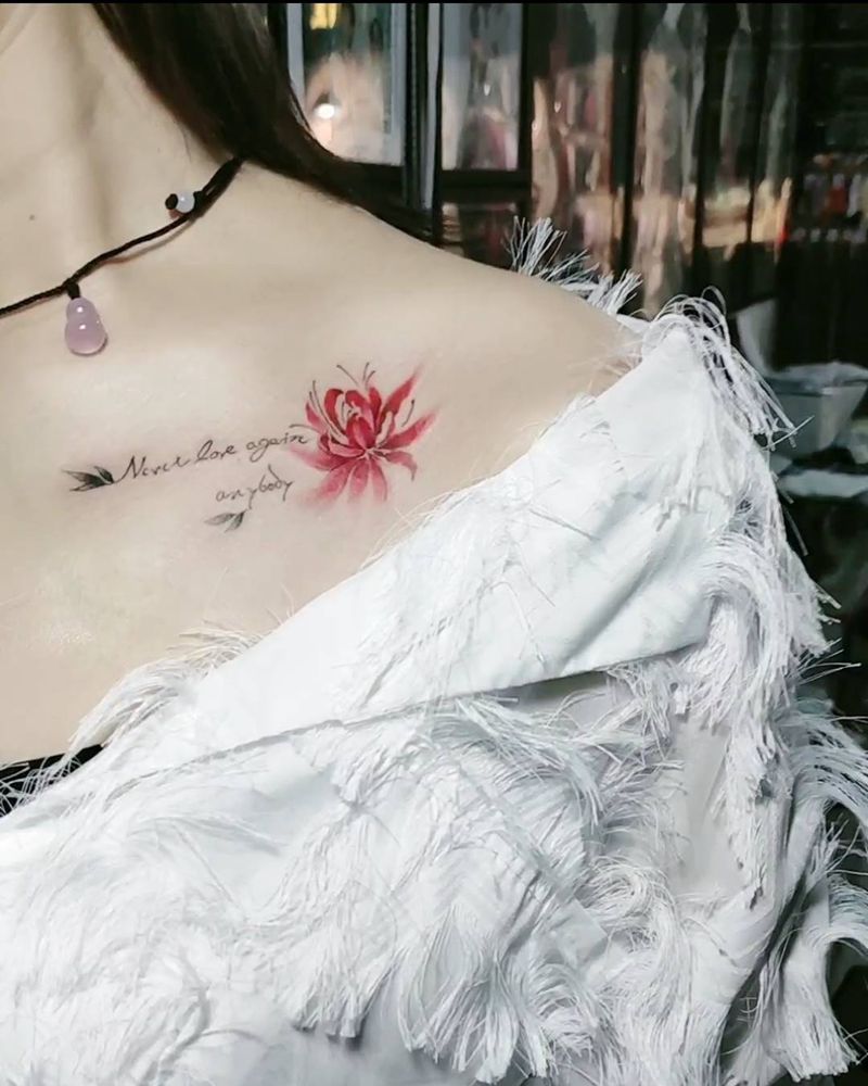 彼岸花纹身图片_胸部新传统欧美写实锁骨纹身图案