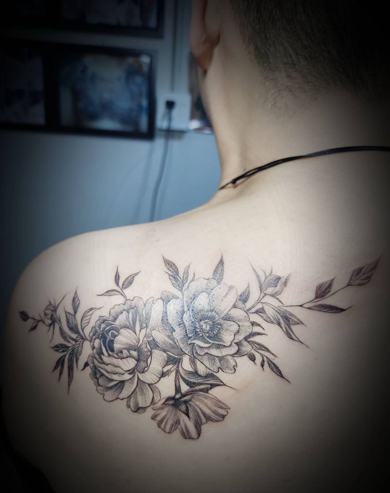 素花纹身图片_肩部点刺欧美写实纹身图案
