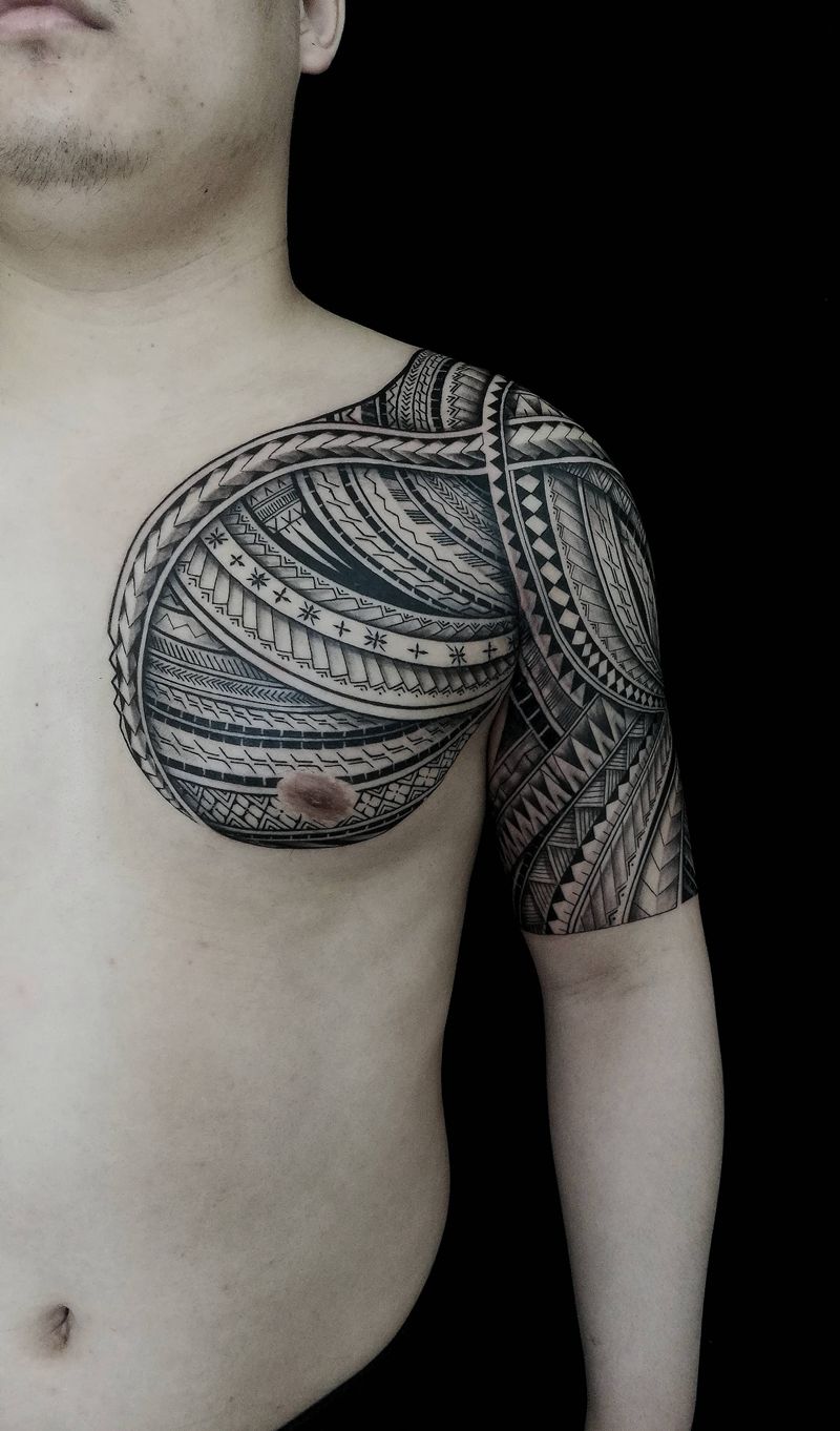 当前位置: 首页 >山西省太原市纹身店-古韵堂~青山纹身艺术工作室纹身图案>玛雅图腾半甲纹身图片_肩部胸部图腾几何纹身图案