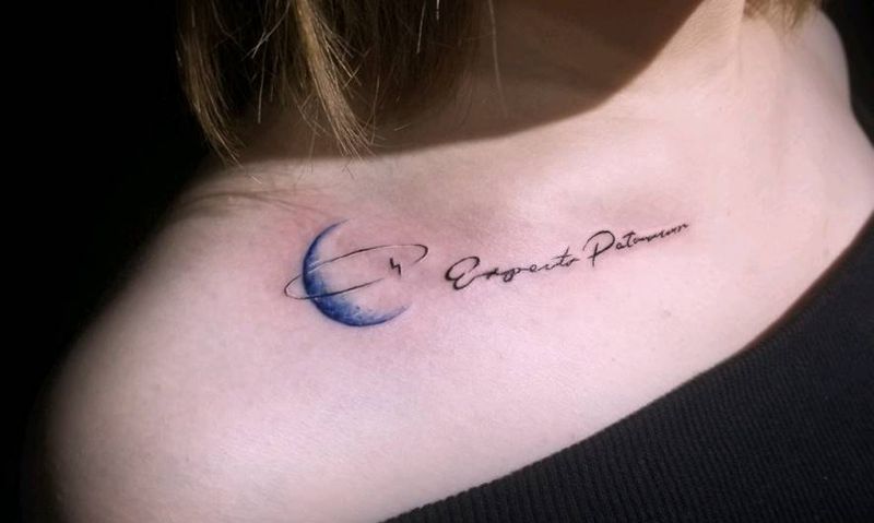 月亮纹身图片_肩部水彩哈利波特月亮纹身图案