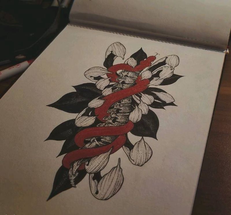 原创手稿纹身图片_手臂腰部New School点刺蛇脊椎菊花纹身图案