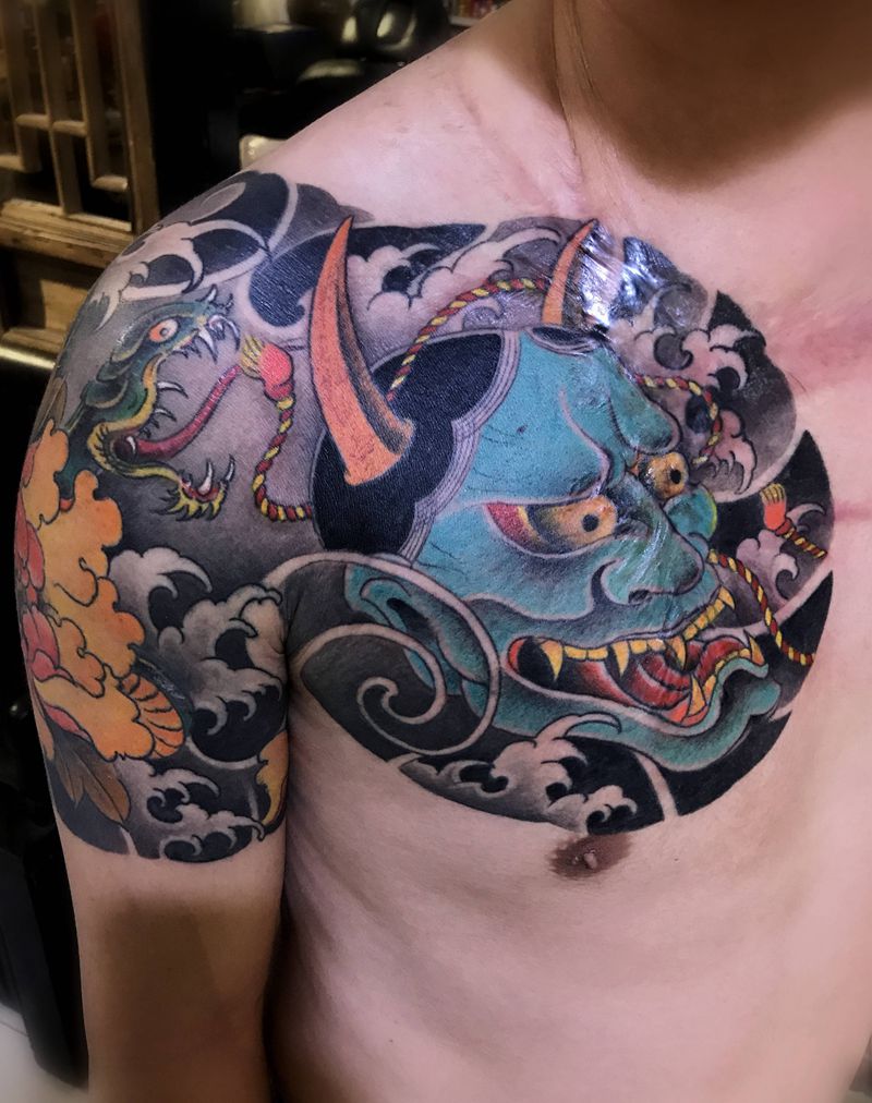 当前位置: 首页 >山西省阳泉市纹身店-问鼎刺客纹身纹身图案>般若半甲遮盖疤痕纹身图片_胸部新传统纹身图案