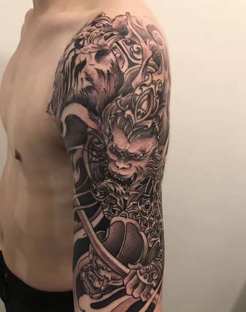 当前位置: 首页 >山西省阳泉市纹身店-问鼎刺客纹身纹身图案>猴子黑灰部分纹身图片_肩部胸部手臂传统动物人物鬼神纹身图案