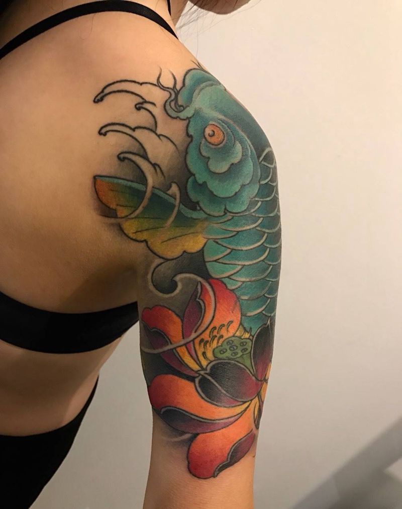 鲤鱼荷花遮盖图腾纹身图片_成品肩部传统动物纹身图案