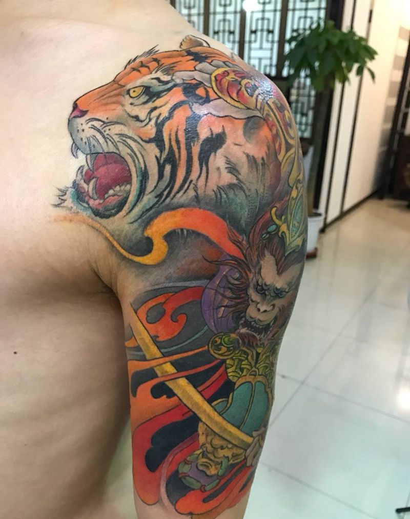 当前位置: 首页 >山西省阳泉市纹身店-问鼎刺客纹身纹身图案>猴子纹身图片_成品肩部胸部手臂传统动物人物鬼神纹身图案