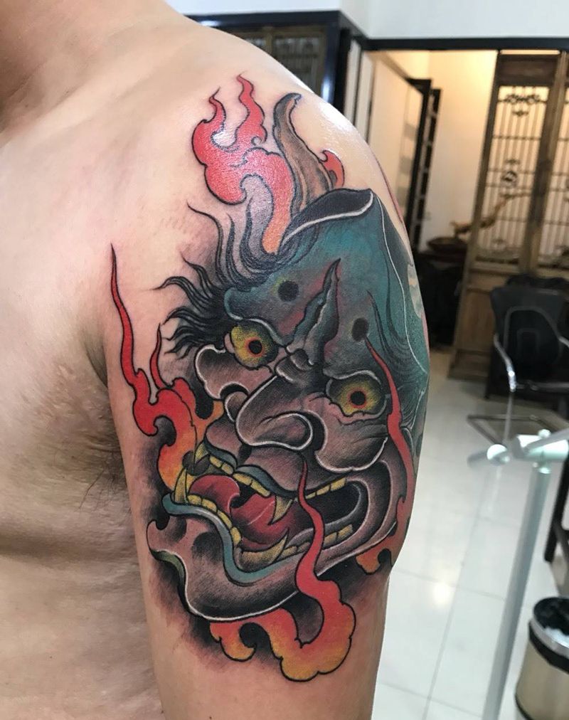 般若遮盖蝎子纹身图片_手臂成品传统鬼神纹身图案