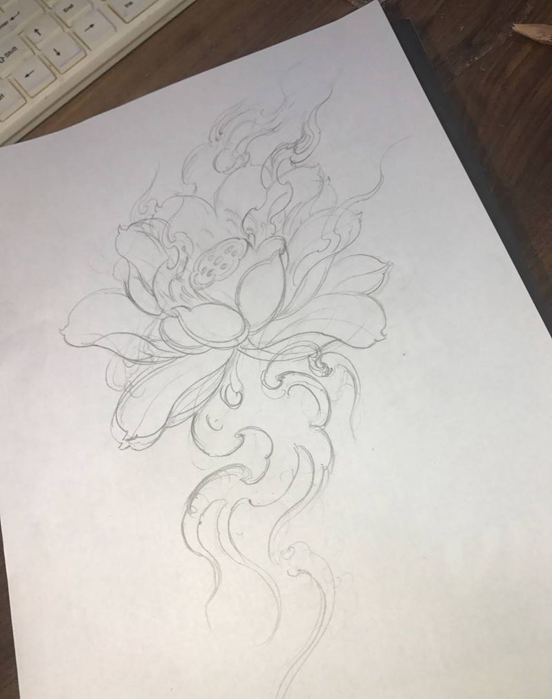 荷花纹身图片_成品背部传统植物原创纹身图案