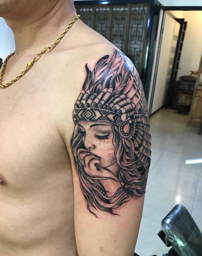 当前位置: 首页 >山西省阳泉市纹身店-问鼎刺客纹身纹身图案>印第安人头像纹身图片_成品手臂人物纹身图案