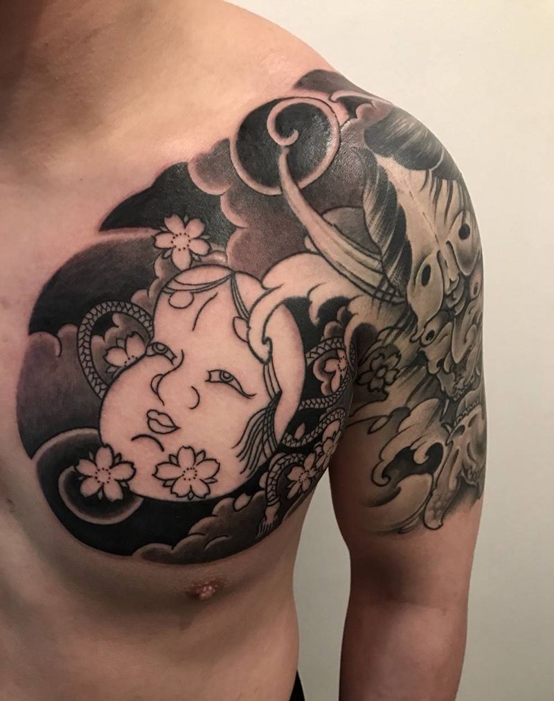 般若半甲纹身图片_成品胸部传统人物纹身图案