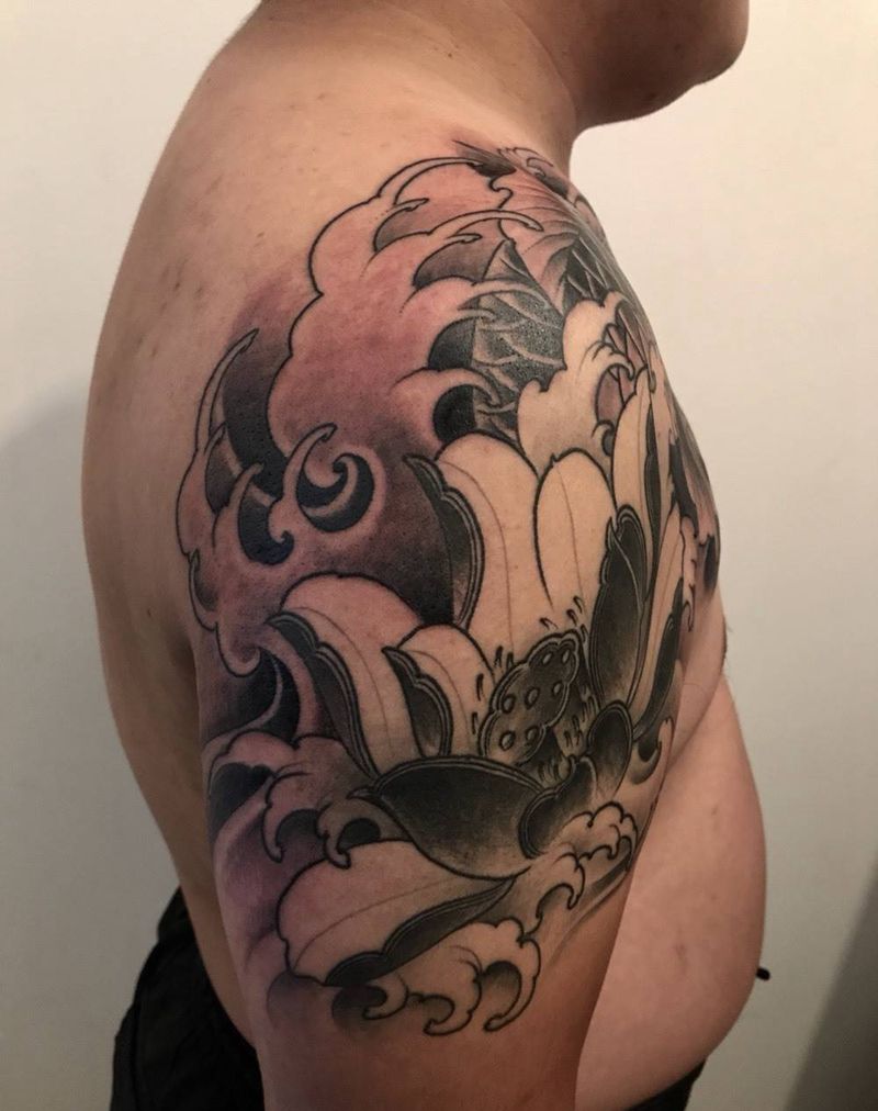 鲤鱼荷花半甲纹身图片_成品胸部传统动物植物纹身图案