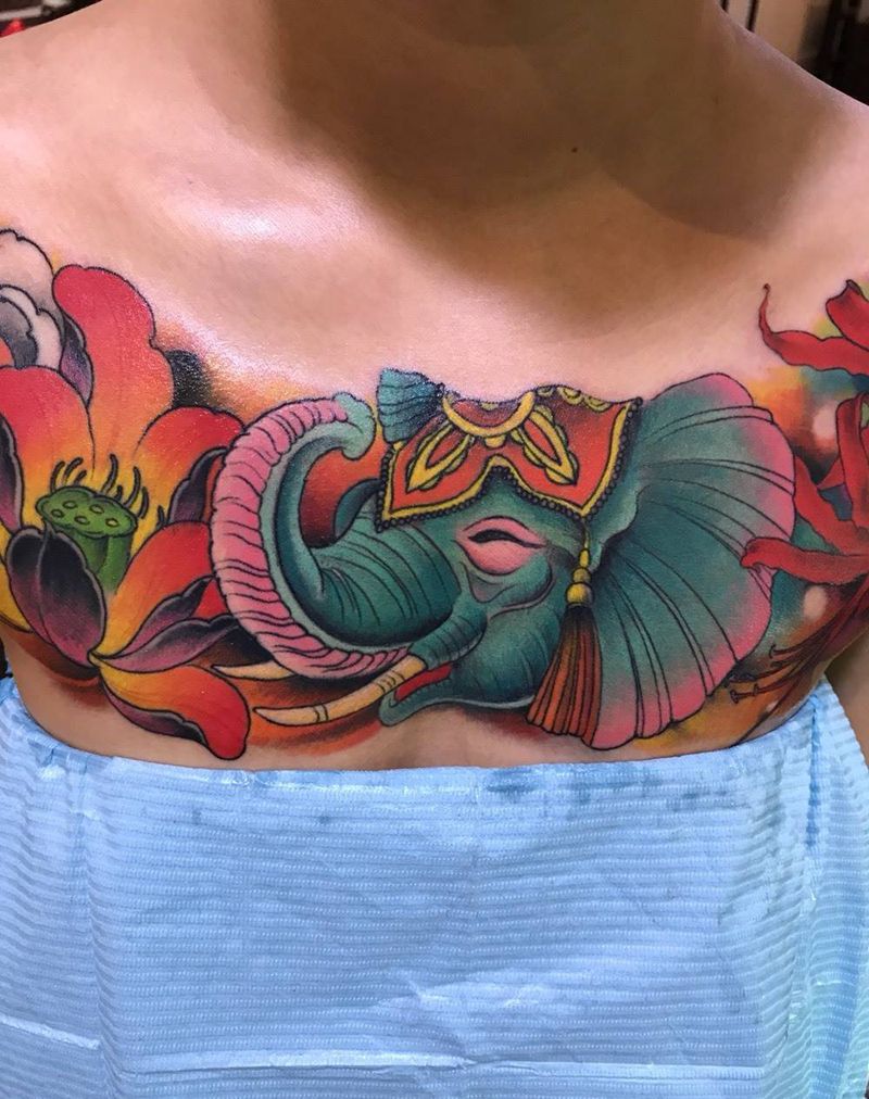 当前位置: 首页 >山西省阳泉市纹身店-问鼎刺客纹身纹身图案>象神花胸纹身图片_成品胸部传统动物人物植物原创纹身图案