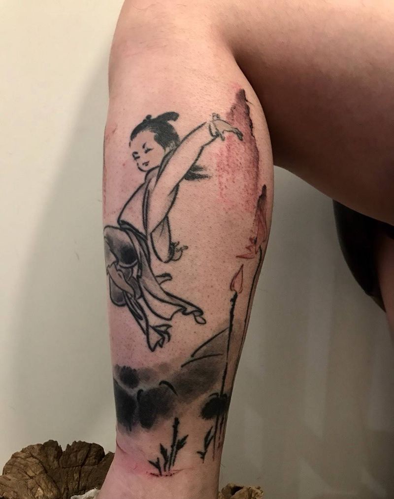 山水纹身图片_腿部新传统纹身图案