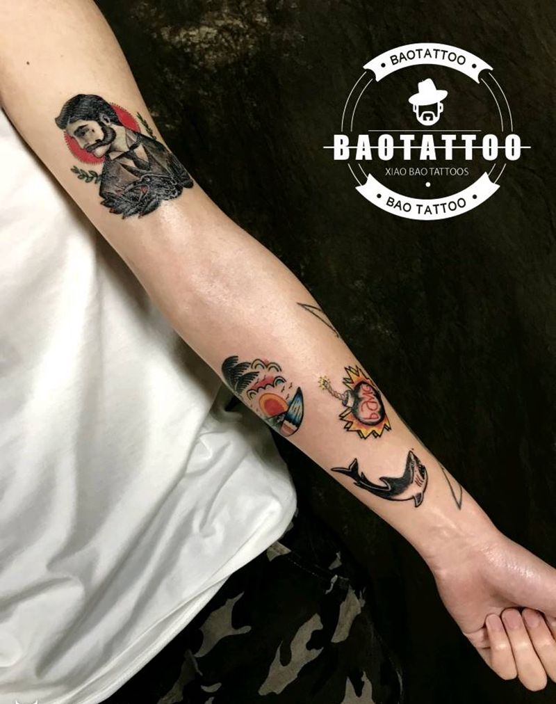 当前位置: 首页 >山西省太原市纹身店-灵药刺青TATTOO纹身图案>old school待续纹身图片_手臂欧美成品纹身图案
