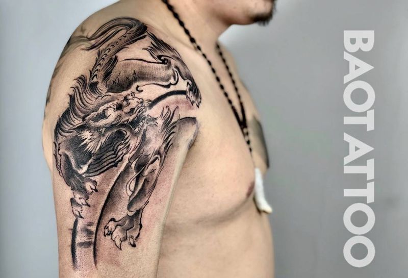当前位置: 首页 >山西省太原市纹身店-灵药刺青TATTOO纹身图案>麒麟纹身图片_手臂水墨纹身图案