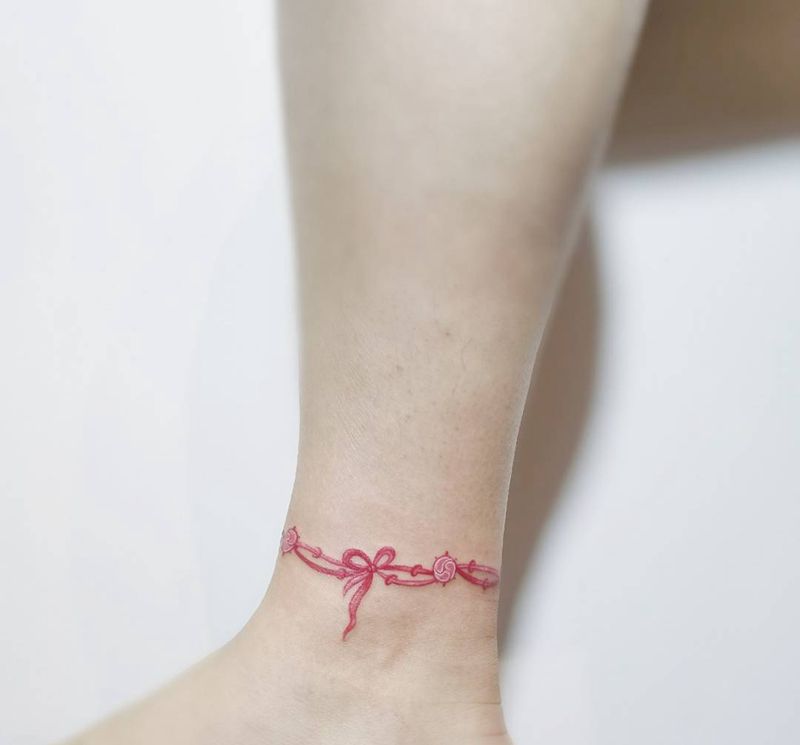 国风绳结纹身图片_脚部腿部水彩New School蝴蝶结脚环小清新纹身纹身图案