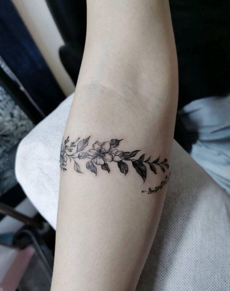 素花臂环纹身图片_手臂手部新传统花体字小清新素花臂环纹身图案