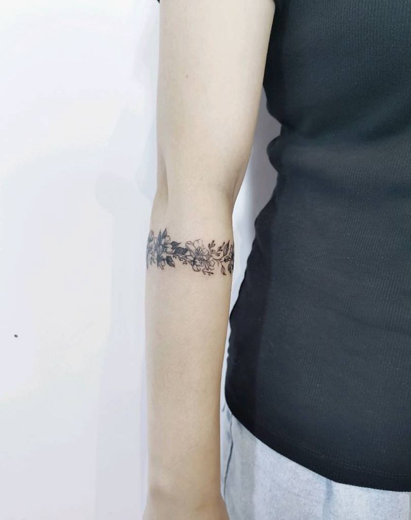 素花臂环纹身图片_手臂手部新传统花体字小清新素花臂环纹身图案
