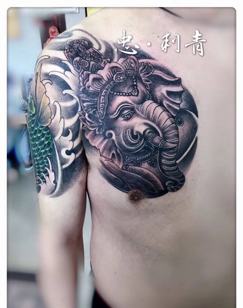 当前位置: 首页 >山西省阳泉市纹身店-欣殿纹身图案>遮盖,半甲, 象神纹身图片_手臂肩部新传统纹身图案