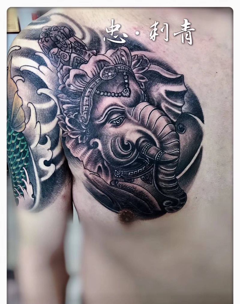 当前位置: 首页 >山西省阳泉市纹身店-欣殿纹身图案>遮盖,半甲, 象神纹身图片_手臂肩部新传统纹身图案