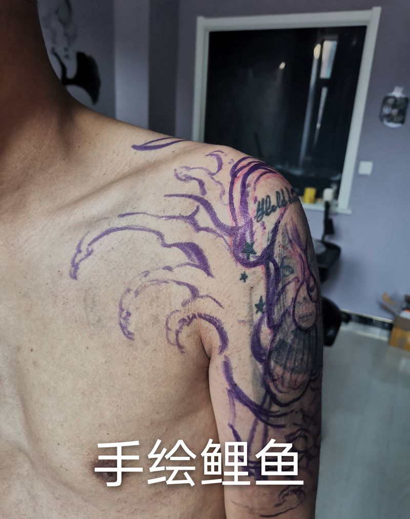 当前位置: 首页 >山西省大同市纹身店-灵泽刺青纹身图案>遮盖毁皮纹身纹身图片_肩部手臂新传统鱼浪花遮盖纹身图案